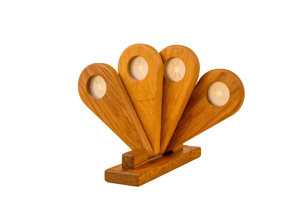Держатель выполнен из ценных пород кавказского дуба. Компактная конструкция с четырьмя лопастями позволяет размещать до 4-х веников, обеспечивая их полное просушивание. Это продлевает срок службы веников, предотвращает сырость и плесень.
