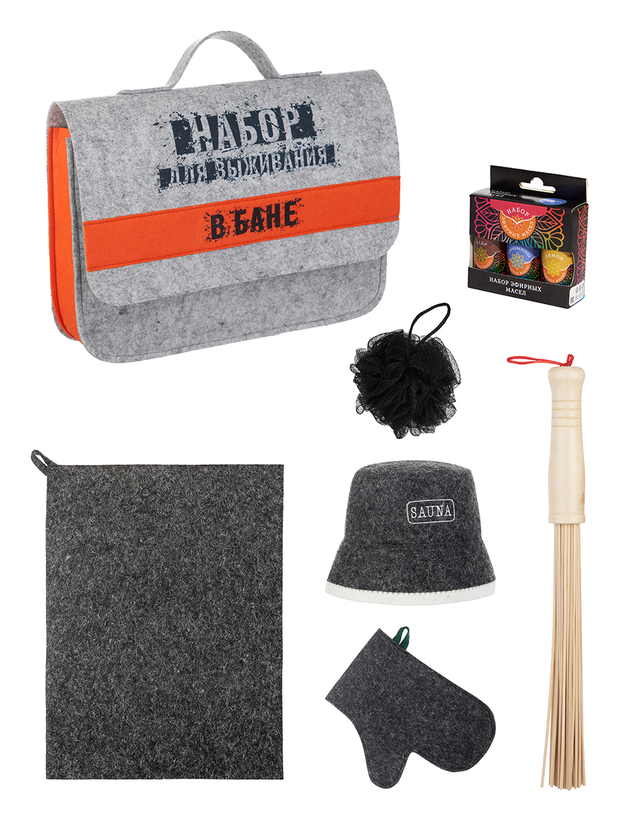 Набор для бани в портфеле «Для выживания в бане» (шапка,рукавица,коврик,веник, масла,мочалка)
