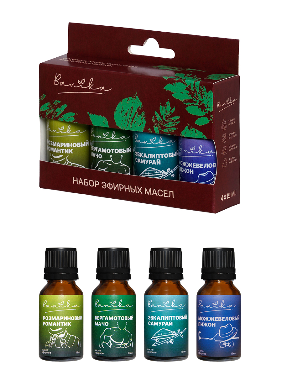 Полное наименование Набор масел эфирных «Banika» Для него» (эвкалипт, бергамот, можжевельник, розмарин), 4х15мл