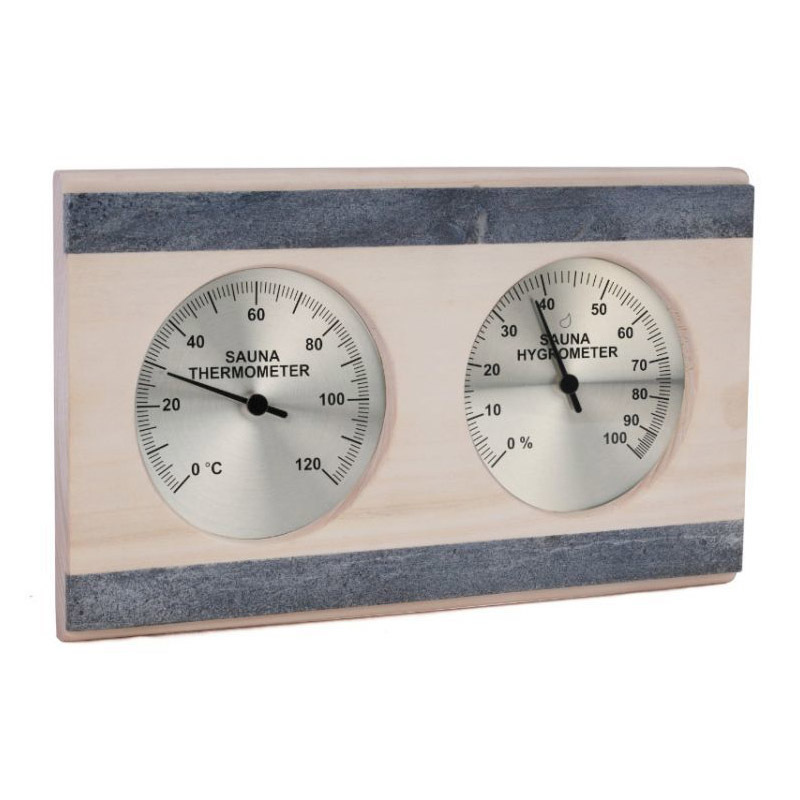Измерительный прибор для парного помещения. Показывает температуру и влажность. Материал: осина, талькохлорит Способ измерения: механика, спирать накаливания