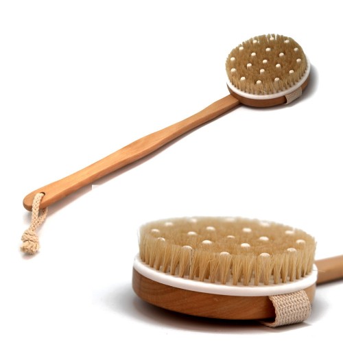 Деревянная щетка с натуральной щетиной и мягкими шипами для дополнительного массажного эффекта. Ручка съемная.